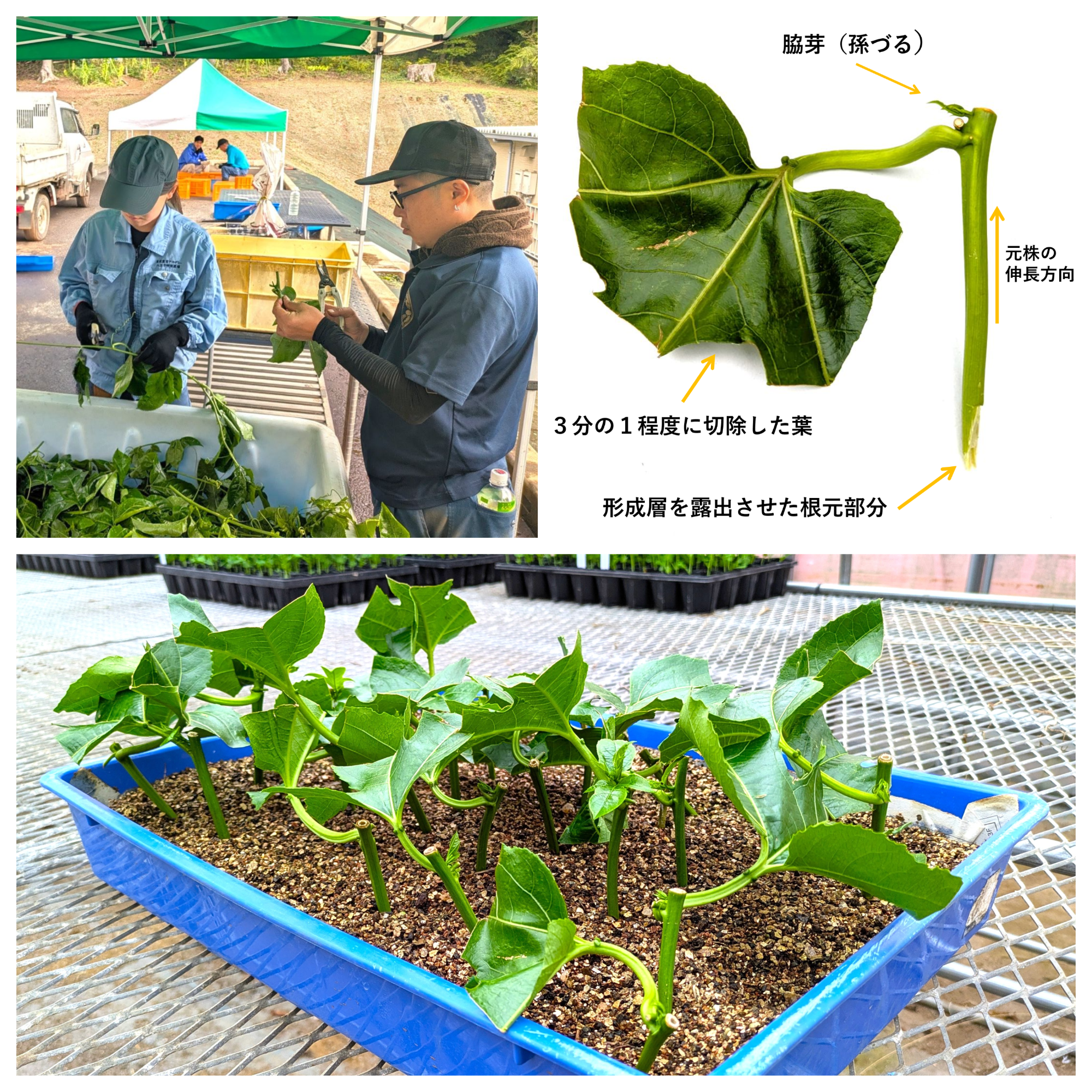 来年に向けて、パッションフルーツの挿し木を行いました。 まず、挿し穂とする良質な枝を採取するために、結果枝から出る脇芽(孫づる)を1₋2カ月ほど延ばして置き、さらに、採取する1週間ほど前に尿素の液肥を葉面散布し、葉色の濃い枝を準備します 挿し木は、小さな脇芽を持った孫づるを1節ずつ切り取り、挿し穂とします。採取した挿し穂の葉を3分の1程度まで切除し、根元は片方を斜めに切り、もう一方は、接木ナイフで1㎜程度削り形成層を露出させます。その後、発根促進剤(メネデール等)を切り口につけ、たっぷりと水を吸わせたバーミキュライトに挿し込みます。 作成した挿し木は、高温(25~30℃)、高湿な場所で管理します。順調に生育すると2週間程度で鉢上げできる程度まで発根します!