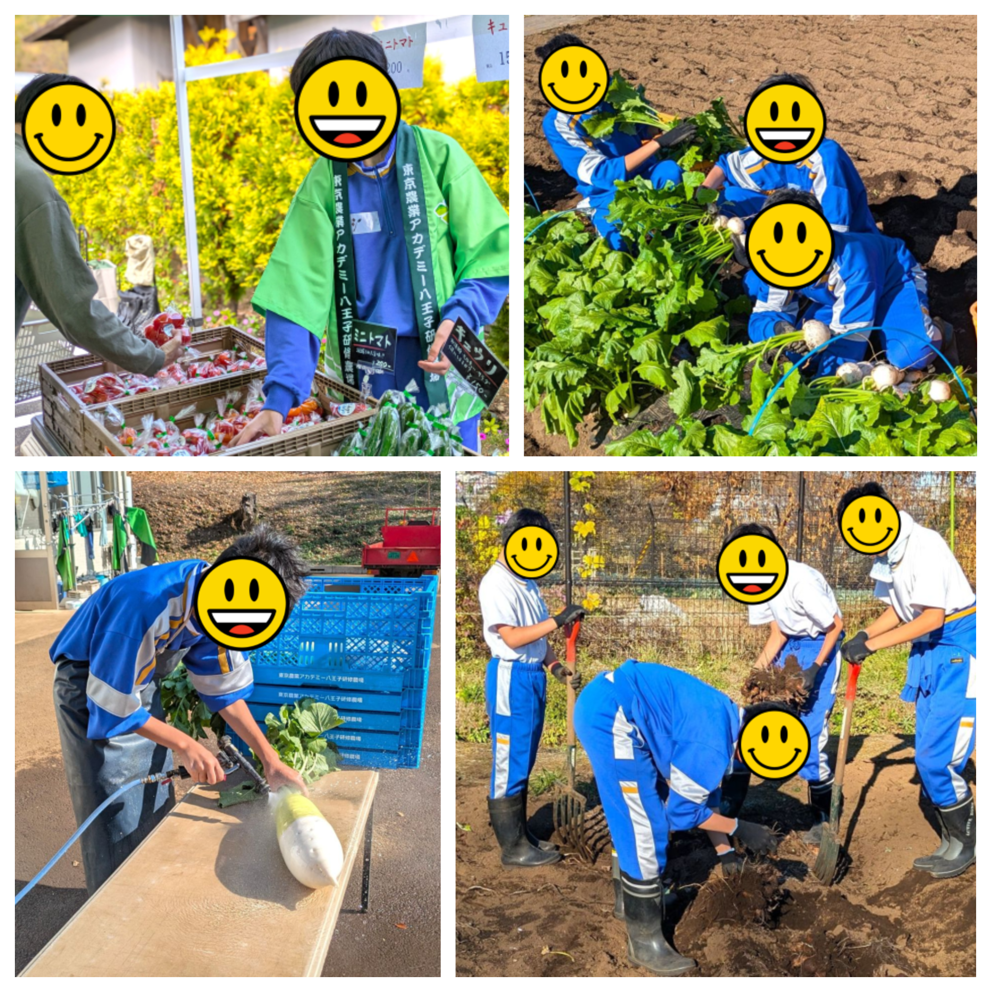 11月26日から28日の3日間、八王子市立第一中学校の生徒4名の職場体験学習を受け入れました。ダイコン、カブ、サトイモ、パパイヤなどの収穫、直売用の荷造りなどを体験してもらいました。重いものを運ぶなど大変な作業もありましたが、皆さんとても楽しそうに農作業をしていました。また、直売では初めての接客とのことでしたが、自分たちが荷造りした商品を笑顔で一生懸命販売してくれました。