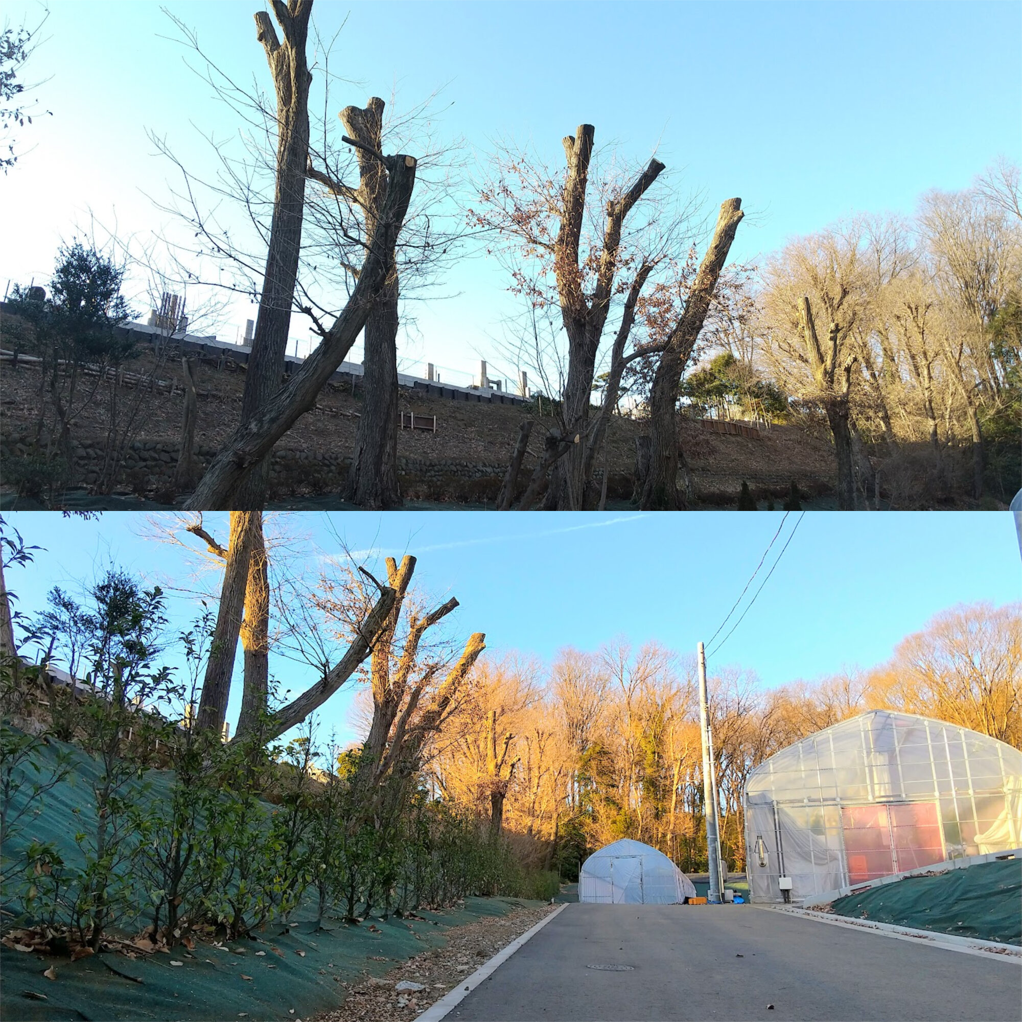 八王子研修農場は、近くに都立小宮公園があり、多くの樹木が生い茂る緑豊かなところです。春は新緑、夏は緑陰、秋は紅葉と私たちの目を楽しませてくれます。しかし、研修棟のある場所はやや谷間にあり、東西が大径木に挟まれているため、日照量が少ないという問題が生じていました。そこで今回、ビニルハウスを影にしている数本のクヌギやコナラなどの枝下ろしを行いました。これでビニルハウス内に光が入り、日照不足の解消や暖房の灯油代の低減につながればと期待しています。