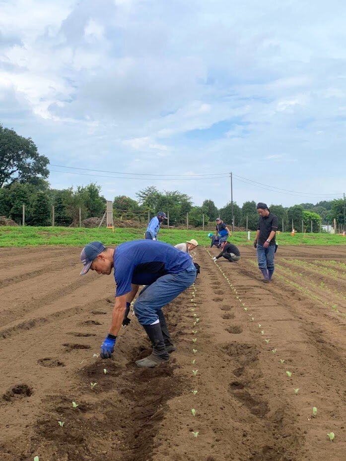 雨が降らない日が続くと土壌はカラカラ。幼い苗達はしっかりと根付くまで適度な水分が必要です。気を揉みながら空を見上げるものの雨が降る気配はないため、灌水チューブで散水。灌水チューブは6方向に水が散り、無風であれば6m幅ほどの範囲を潤してくれます。40mほどのホースをみんなで抱えて畝の上をまたいで移動する風景は微笑ましいですね。でも、就農後は1~2人で行わねば!