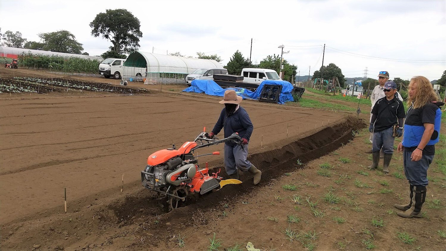 畑の条件にもよりますが、大雨やゲリラ豪雨を受けると畑の中に雨水の道ができて種や苗等が流されてしまいます。この畑はやや傾斜しているので川のように流れてしまうことがあるので、雨水が変に畑の中を流れないようにするため、適宜畑の周りを管理機で溝掘りを行っています。地面が固いと難しいですが安全指導も受けながらバッチリ掘っています。