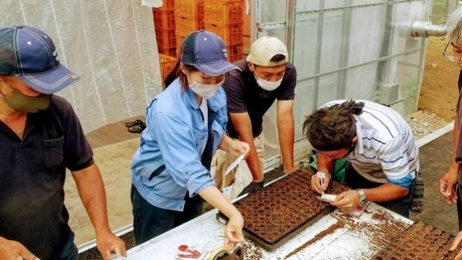 大玉、中玉、ミニトマトなど5種類のトマトをセルトレイに播種しています。 最近では種一粒が50円前後する品種も多く、小さな種を紙の折り目に並ばせて先の細い棒で一粒ずつ丁寧に播いています。夏越しが難しい作型になりますが、新たな軒高ハウス内に設置した東京エコポニックによる抑制栽培に挑戦します(6月1日)