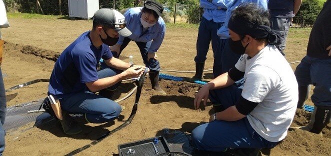 畑がカラカラに乾いており、種まき後の灌水を行なうため、先日習ったばかりの灌水チューブとホースの接続方法を思い出しながら、1年生だけでばっちり設置しています。東京農業アカデミーも2年目を迎えたばかり。1年生にとっては始まったばかりの研修ですが、先輩がいる恩恵も受けて多くのことをスピーディに吸収しています。(4月26日)