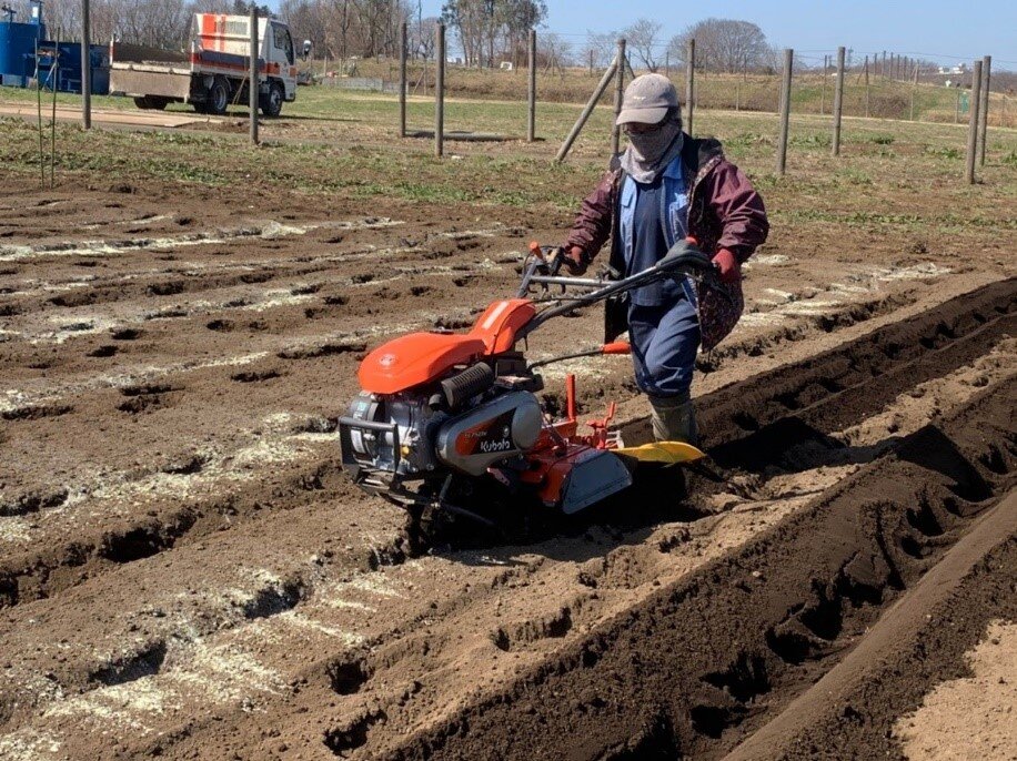 2度目の春作がはじまりました。 重い荷を乗せた一輪車のようにバランスのとりにくい管理機。研修が始まって間もないころは操作するにもふらふらと蛇行していた研修生達でしたが、酷暑と厳しい寒さも乗り越え、1年間切磋琢磨してきた研修の成果が現れています。