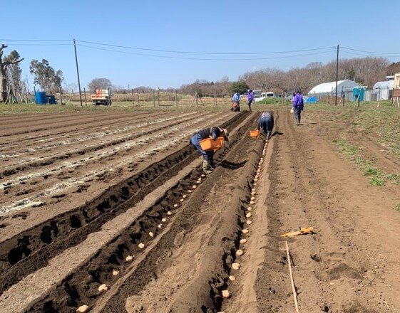 切り口を乾かしておいた種イモをどんどん並べていきます。効率的に体を使おうと工夫する姿に研修生さんたちの個性が出ます。