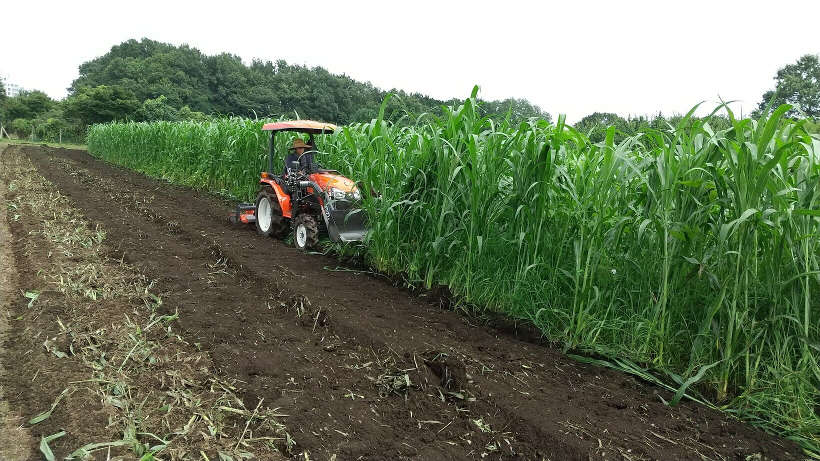 8月3日には荒れた畑を回復させるために、緑肥として育てたソルゴーをトラクターでそのまま畑にすき込みました。
