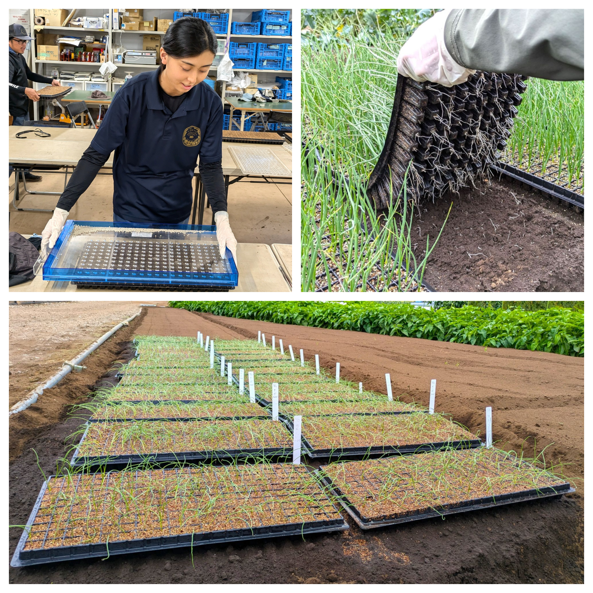 タマネギの定植に向け、苗づくりを進めています。 早生種は収穫時期が早く貯蔵性は低い、中晩生種は収穫時期が遅く貯蔵性は高いという特性に基づき品種選定を行います。今回は、ネギ培養土をつめた200穴のセルトレイに、中早生で作りやすさに定評のある「ターボ」、中生種で辛みが少なく生食向きの湘南レッド、貯蔵性に優れる中晩種のネオアースの3品種を播種しました。 ポイントは、苗の大きさで最終的な鱗茎重と抽苔の発生が決まるという点です。過大に成長した苗や、窒素不足は抽苔のリスクが高まるため、葉鞘(苗の白い部分)の直径が6~8mmを目標に育苗します。 定植は、播種後55~60日後にする予定ですが、より充実した苗づくりをするため、苗はセルトレイごと地床へ移し、亜リン酸液肥を施用しました。ただし、根鉢を抜けやすくするため、時々セルトレイを持ち上げるようにしています。