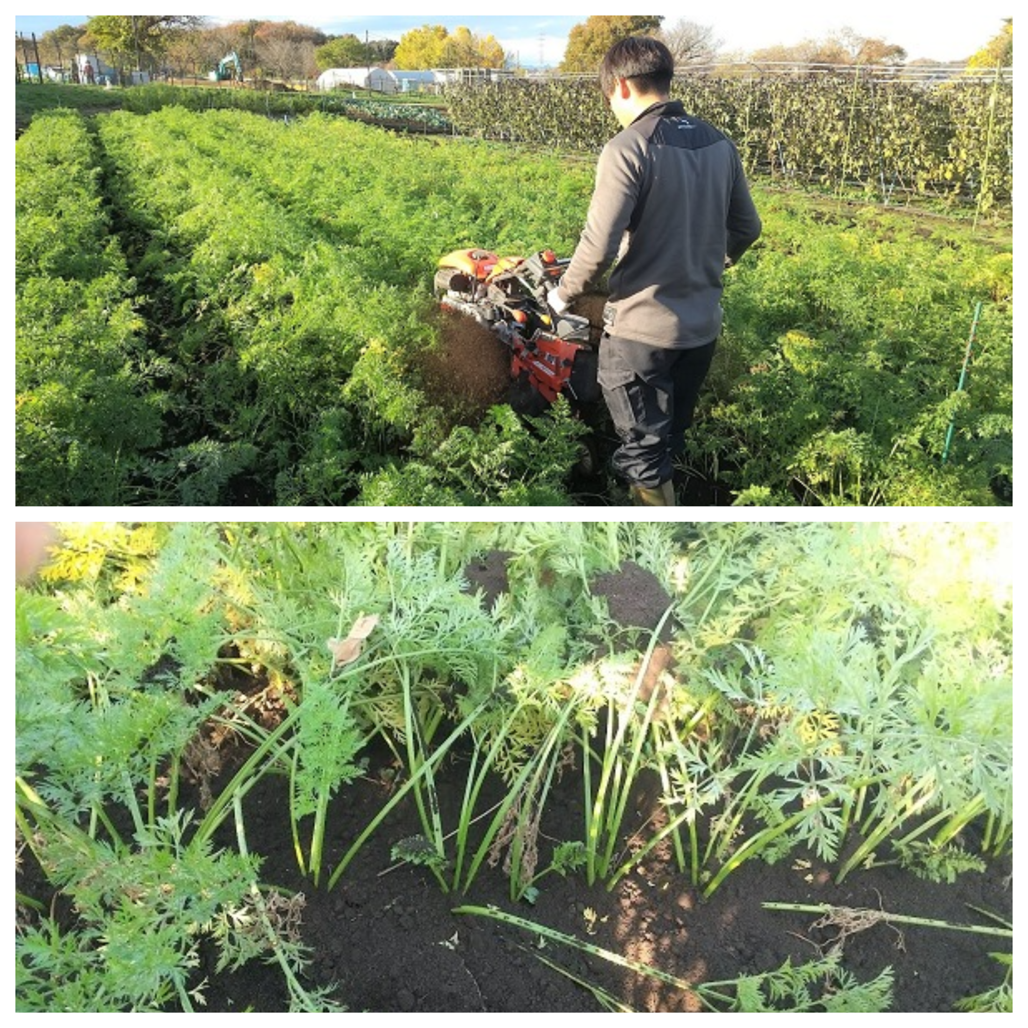いよいよ本格的に寒くなってきました。アカデミーでも畑の冬支度を開始しています。今日はニンジンの霜対策を行いました。ニンジンは、土から根っこの肩の部分が出ている状態で霜にあたってしまうと痛んでしまうため、今の時期に土寄せを行います。一輪管理機を使って、肩が隠れるように土寄せを行いました。ニンジンは2月頃まで徐々に収穫していきます。