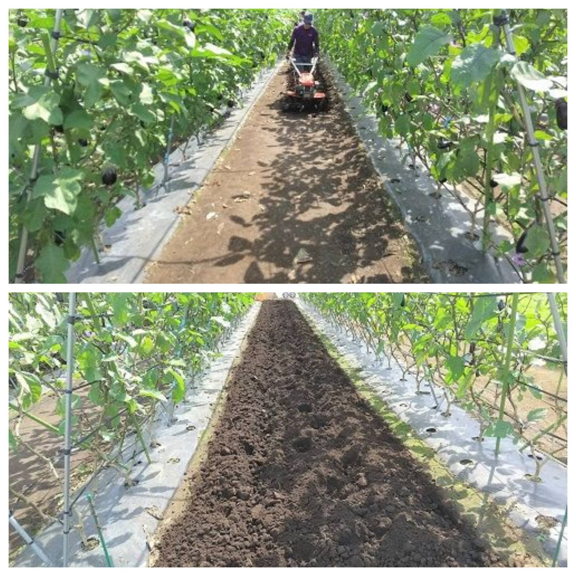 ナス(自根)の木の勢いが落ちてきたので、通路の防草シートを剥がし、中耕作業を行いました。収穫や管理作業により踏み固められた畝間を耕起することで、土の通気性を高め、根の成長を促すことが出来ます。同時に追肥も行い、ナスの樹勢回復を促します。ナスは霜が降りる11月初旬頃まで収穫を行う予定です。