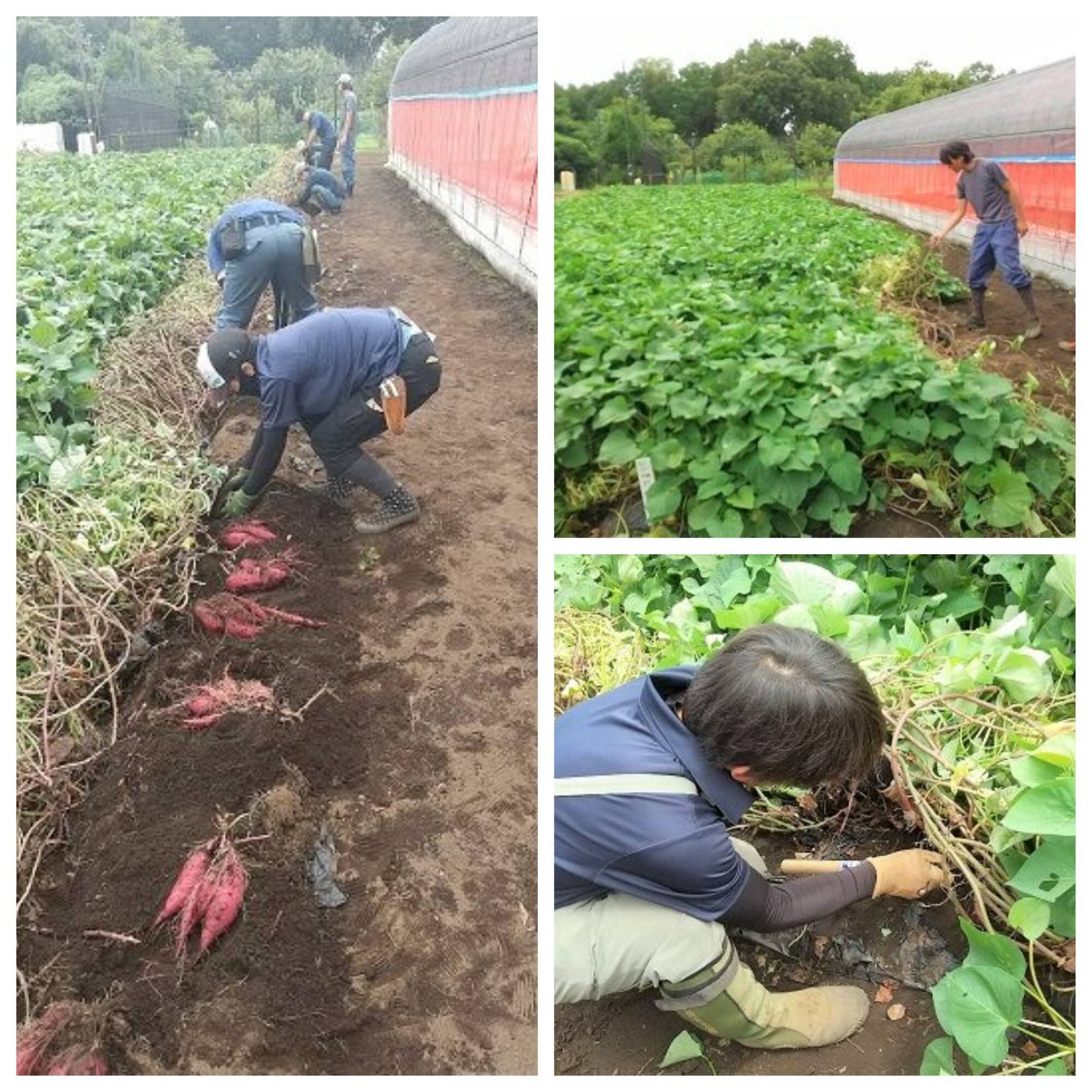 サツマイモの収穫時期としてはやや早いですが、25㎝程度まで肥大したので収穫を開始しました。つるを根元から刈り取ってから掘り取ります。今日は70株程度なので、掘り取り機は使わず、手作業で芋を掘りました。収穫後は2週間ほど追熟させるとより甘く、美味しくなります。これから11月頃まで順次収穫をしていきます。