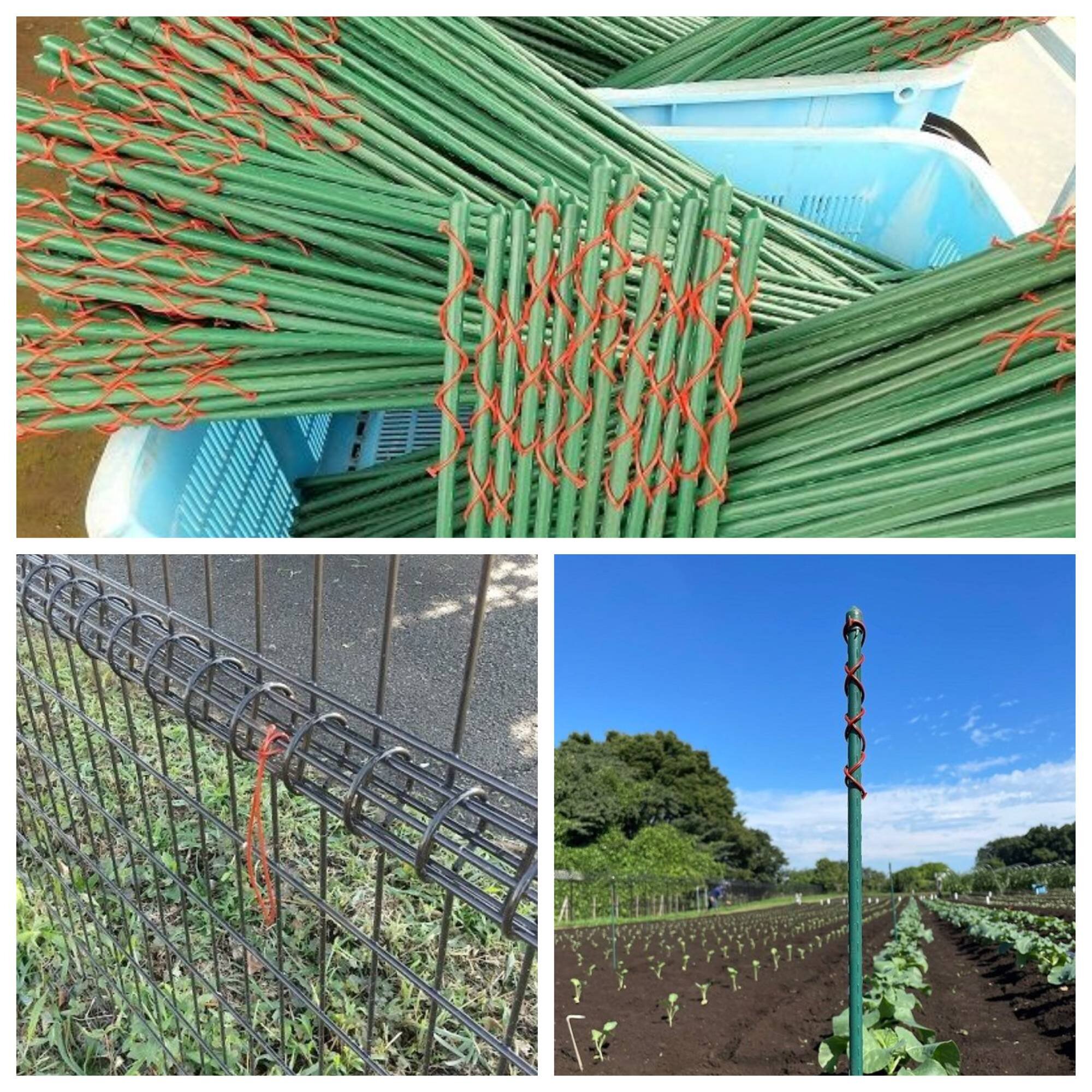 コンフューザーVという交信かく乱剤と呼ばれる資材を畑に設置しました。この交信かく乱剤は人工合成した害虫の雌の性フェロモンを封入した製剤で、これを支柱等に巻き付けて畑の各地に設置します。すると、雄が惑わされて雌と出会えなくなり次世代の害虫の発生を防ぐことができます。また、有効成分は虫の作る匂い成分であり毒性は非常に低く安全で、微生物等により容易に分解されるため環境にもやさしいという特徴を持っています。 今回設置したコンフューザーVはコナガ、ハスモンヨトウ、オオタバコガなど様々な害虫を対象とした剤です。できるだけ大きな面積で使用すると効果的なので、アカデミーでは圃場全体の約2haに1000本の資材を設置しました。 アカデミーでは環境に配慮した新しい技術を積極的に導入しています。