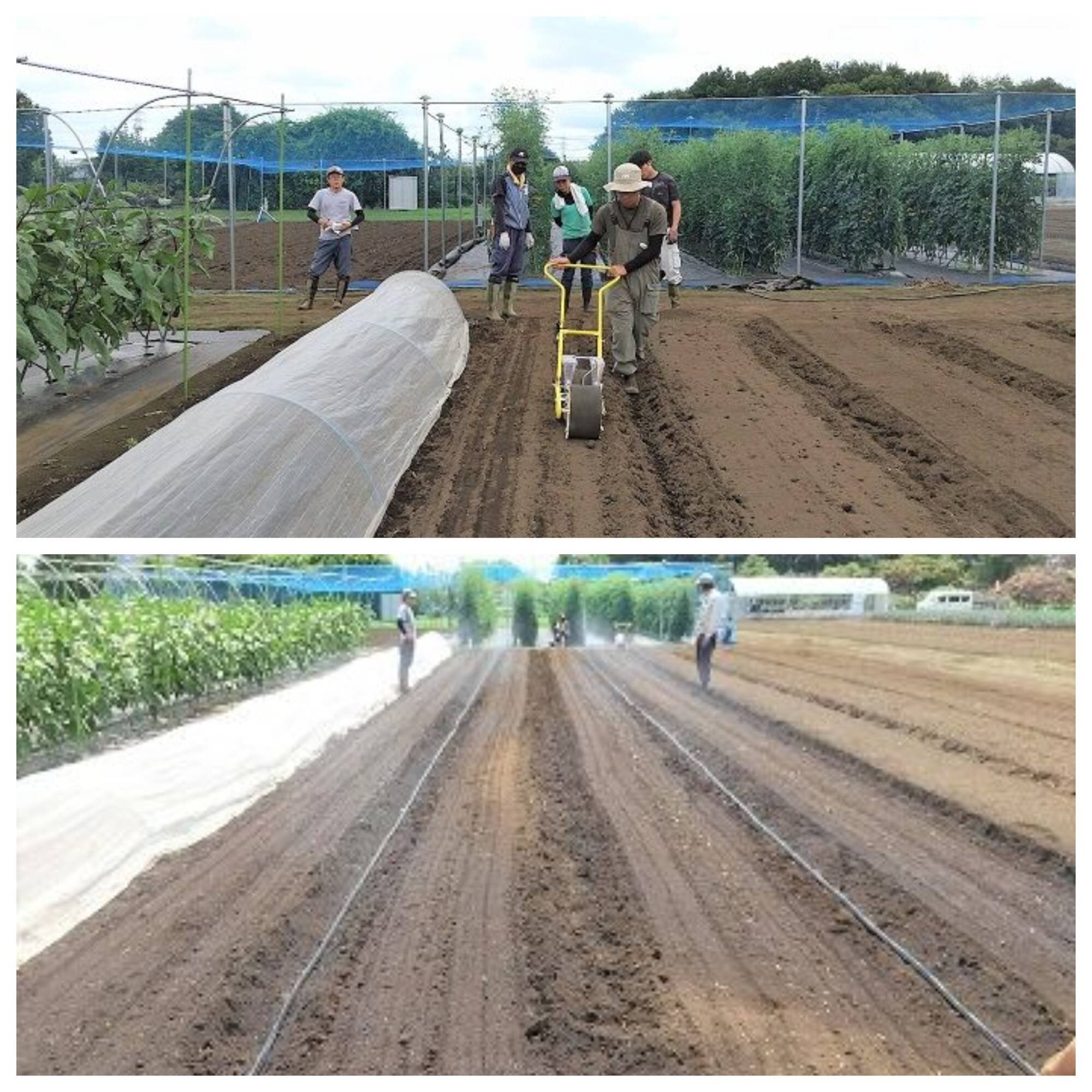 ニンジンの種まきを行いました。枝豆やトウモロコシのように手作業ではなく、クリーンシーダーという播種器を使って種を撒きます。このクリーンシーダーは走らせるだけで、播種溝を掘り、一定の間隔で種を落とし、覆土もしてくれる優れものです。ニンジンは発芽が安定しないので、土が乾いている場合は、播種後にしっかりと水をやることが大切です。灌水チューブを使ってしっかりと灌水も行いました。順調にいけば1週間ほどで芽が出てきます!