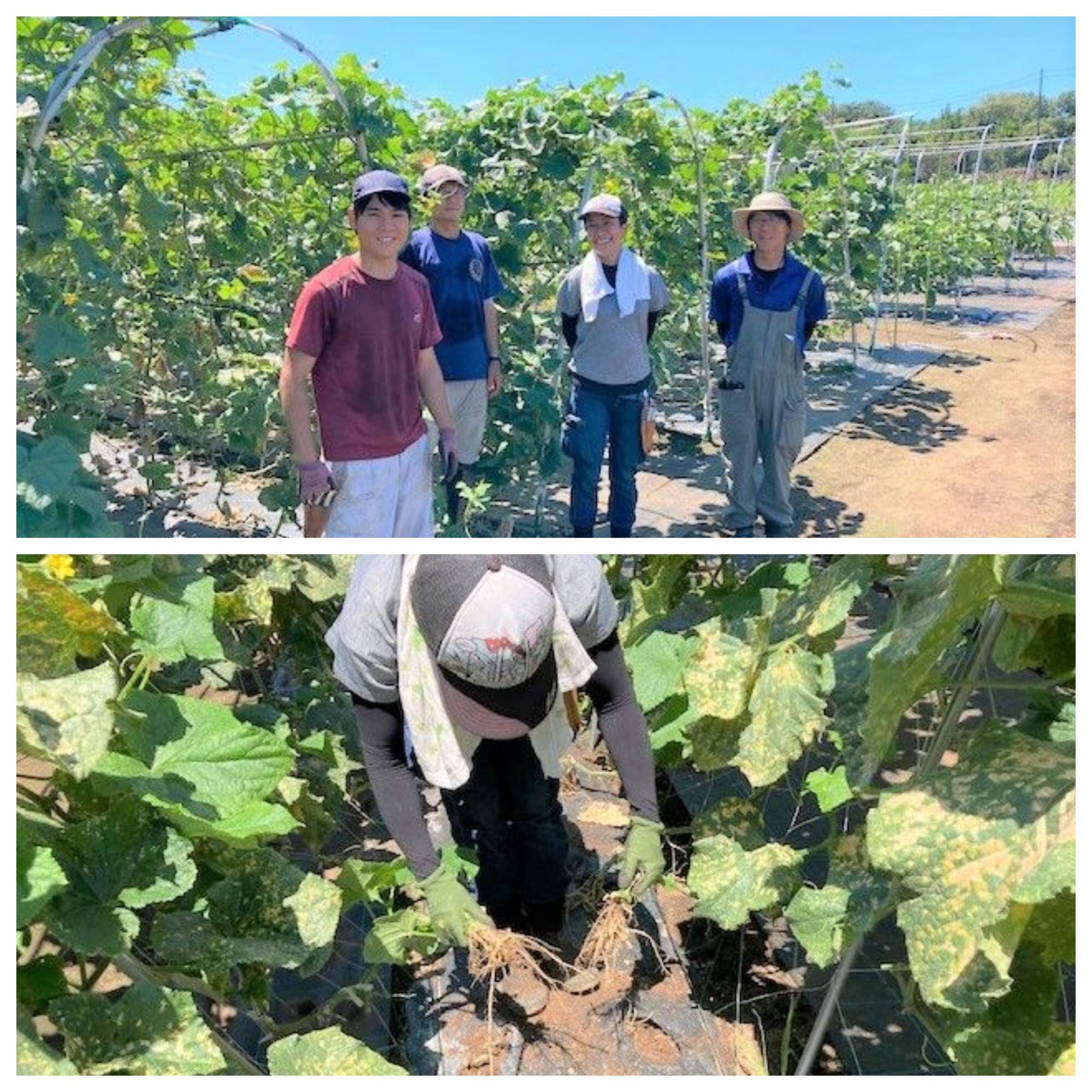 キュウリが収穫最終日を迎えました。もう少し長い期間収穫できそうですが、次期作に備えてここまでとしました。今年は6月から7月上旬の降雨日が多く、べと病などの病気に悩まされましたが、上手く防除をしてここまで収穫をすることが出来ました。毎日の収穫で研修生も苦労しましたが、キュウリに感謝を込めて最後は皆で記念撮影!片付け作業は、まず根っこから株を抜き取り、地上部を萎れさせてから茎を引っ張り、一挙に片付けました。