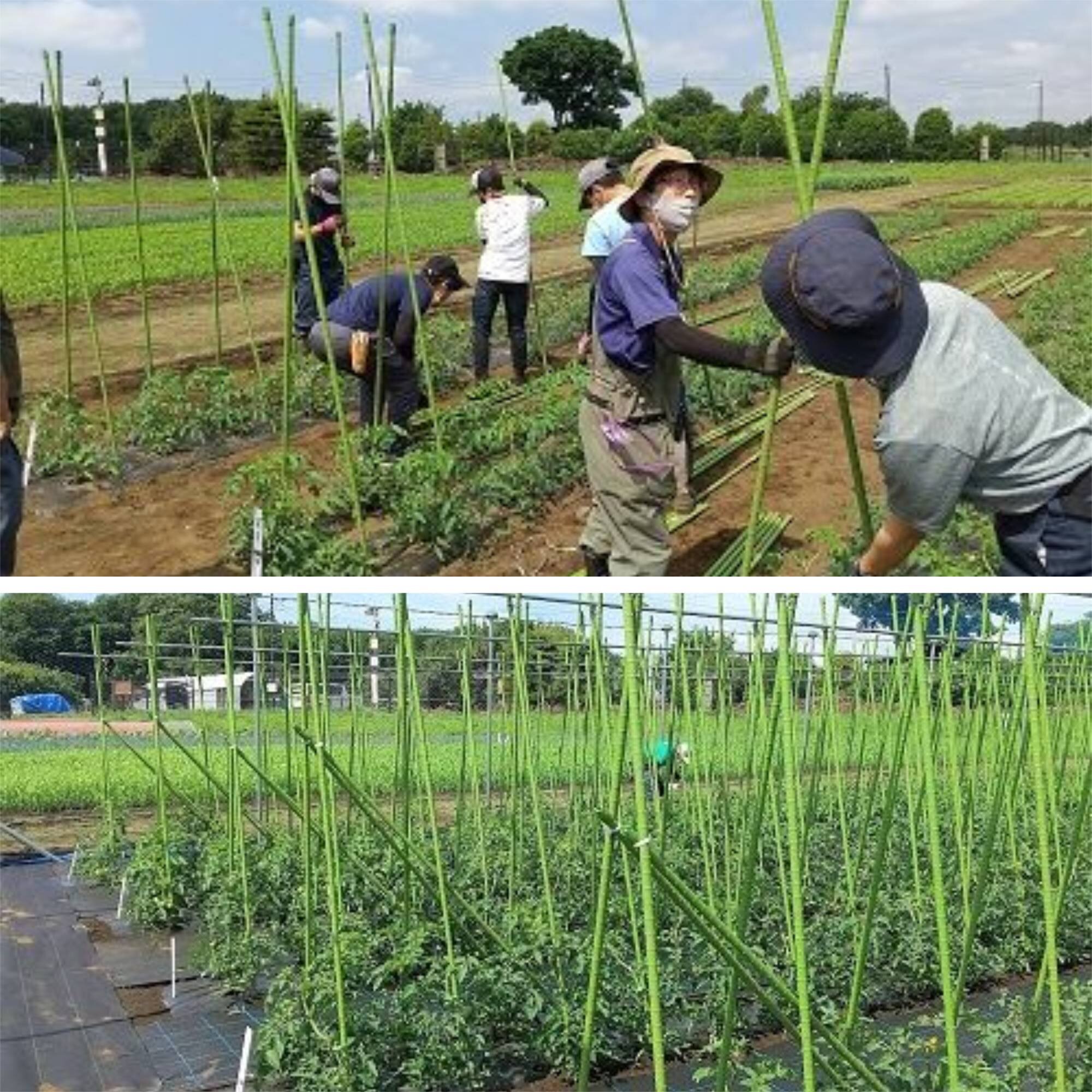 5月11日に定植をしたトマトに支柱を立てました。トマトやキュウリなど倒れやすい果菜類は、支柱などを使い固定し、上向きに枝を成長させることで収量や品質の向上に繋がります。今回は合掌型と呼ばれる方法で設置を行いました。2列に植わったトマトの横にそれぞれ支柱を斜めに挿して交差させ、その上から横向きに支柱を設置し補強します。最後に、トマトの株を起こして、斜めの支柱に沿って誘引します。 これから随時誘引作業を行い、トマトがまっすぐ大きく成長できるよう手助けしていきます。