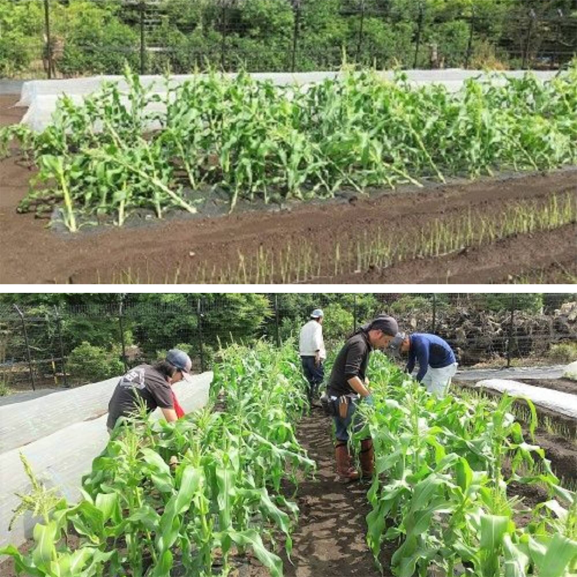 午前中の強風によりスイートコーンが倒伏してしまいました。この時期に株が倒れてしまうと収穫物が曲がったり、子実の発育が悪くなったりしてしまうので、急いで復旧作業を行いました。株を手で起こし、株元をギュッと踏むと、簡単に元に戻すことが出来ます。強い風が吹いた時はどうなることかと思いましたが、その後は順調に育っています。