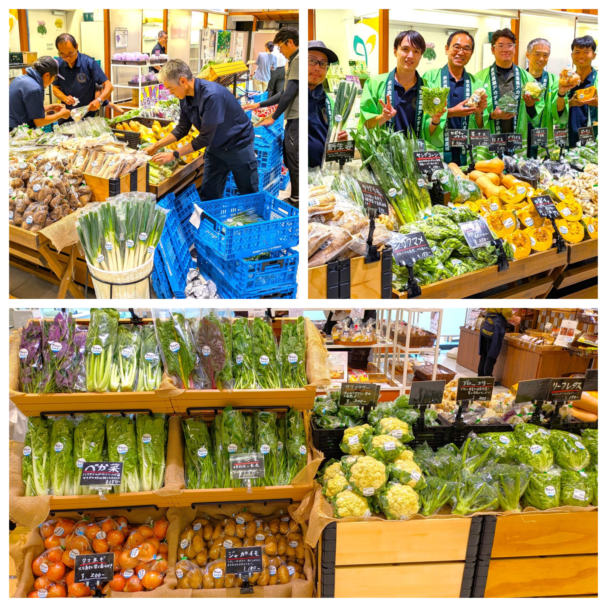 トマト、ネギ、コマツナ、サツマイモなど合計40品目以上、約800点の野菜を初日に出品しました。ブロッコリー、生ラッカセイ、サツマイモなど旬の野菜も多く揃えております。